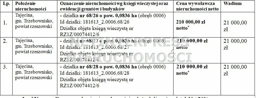Wójt Gminy TrzebowniskoDziałając na podstawie art. 38 ust. 1 i 2 ustawy z dnia 21 sierpnia 1997 r. o gospodarce nieruchomościami ( Dz.U z 2026r., poz. 399 tj.. ), oraz Uchwały Nr V/50/2019 Rady Gminy Trzebownisko z dnia 27 marca 2019r. w sprawie sprzedaży w drodze przetargu nieruchomości położonych w Tajęcinie, stanowiących własność Gminy Trzebownisko.